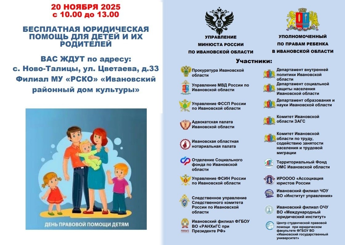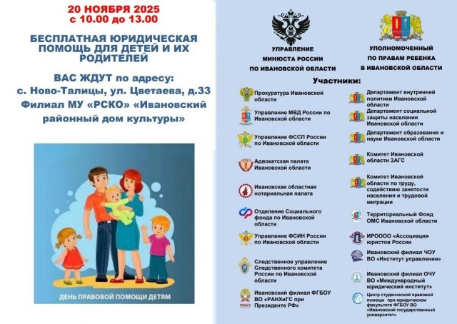 Домой Новости 20 ноября в Ивановском районном доме культуры пройдет День оказания бесплатной юридической... Новости 20 ноября в Ивановском районном доме культуры пройдет День оказания бесплатной юридической помощи детям и родителям Ноя 13, 2025 Консультации проведут представители различных ведомств и служб.