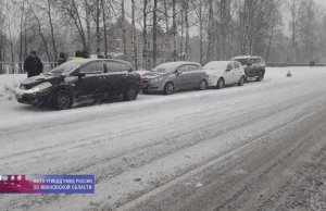 На улице 1-я Шуйская 64-летняя женщина, управляя автомобилем «Тойота Ленд Крузер», совершила наезд на впереди стоящий автомобиль «Рено Сандеро» под управлением 44-летней женщины, который от удара откинуло на стоящий впереди автомобиль «Опель Корса» под управлением 38-летней женщины, который от удара откинуло на впереди стоящий автомобиль «Ниссан Тиида», за рулем которого находилась 42-летней женщина.