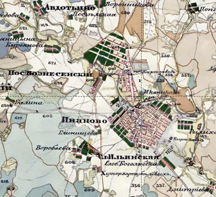 На Статистической карте Шуйского уезда 1815 года хорошо видно, что промышленное село Иваново и деревни Глинищево и Воробьево разделены участками сельскохозяйственных земель.