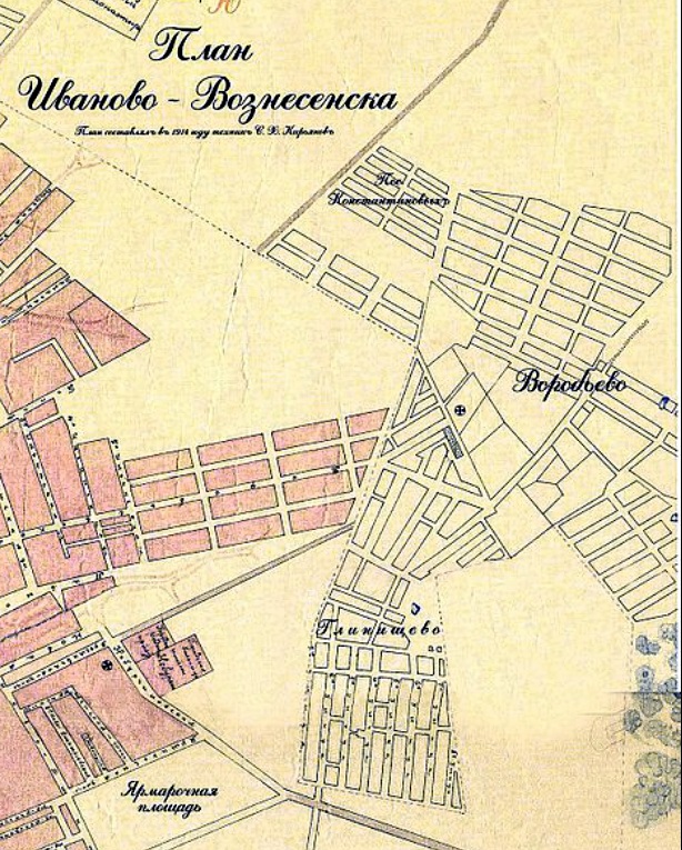 Когда в 1917 г. местечко Глинищево присоединили к городу Иваново-Вознесенску, оно было довольно большим, застроено усадебными кварталами, прилегающими к северо-восточной границе Ильинской слободы. Это хорошо видно на Плане города 1915 года, созданном в годы Первой мировой войны топографом Сергеем Кирьяновым.