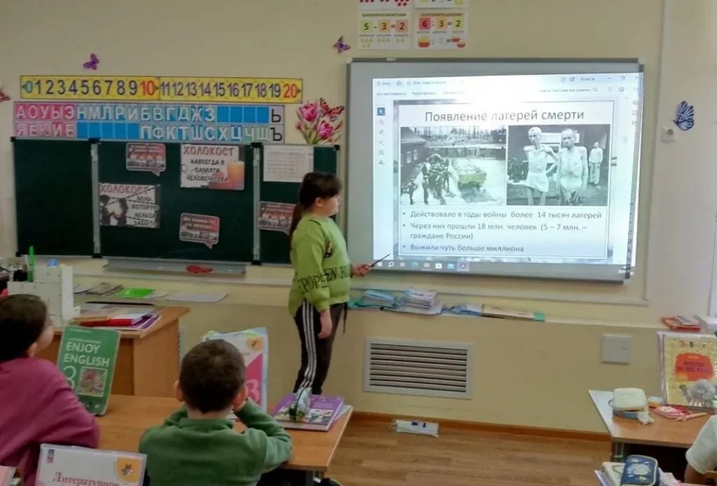 А в Богородской средней школе прошло мероприятие для начальных классов «Международный День памяти жертв Холокоста». Речь шла об освобождении Красной Армией лагеря смерти «Аушвиц» (Освенцим).