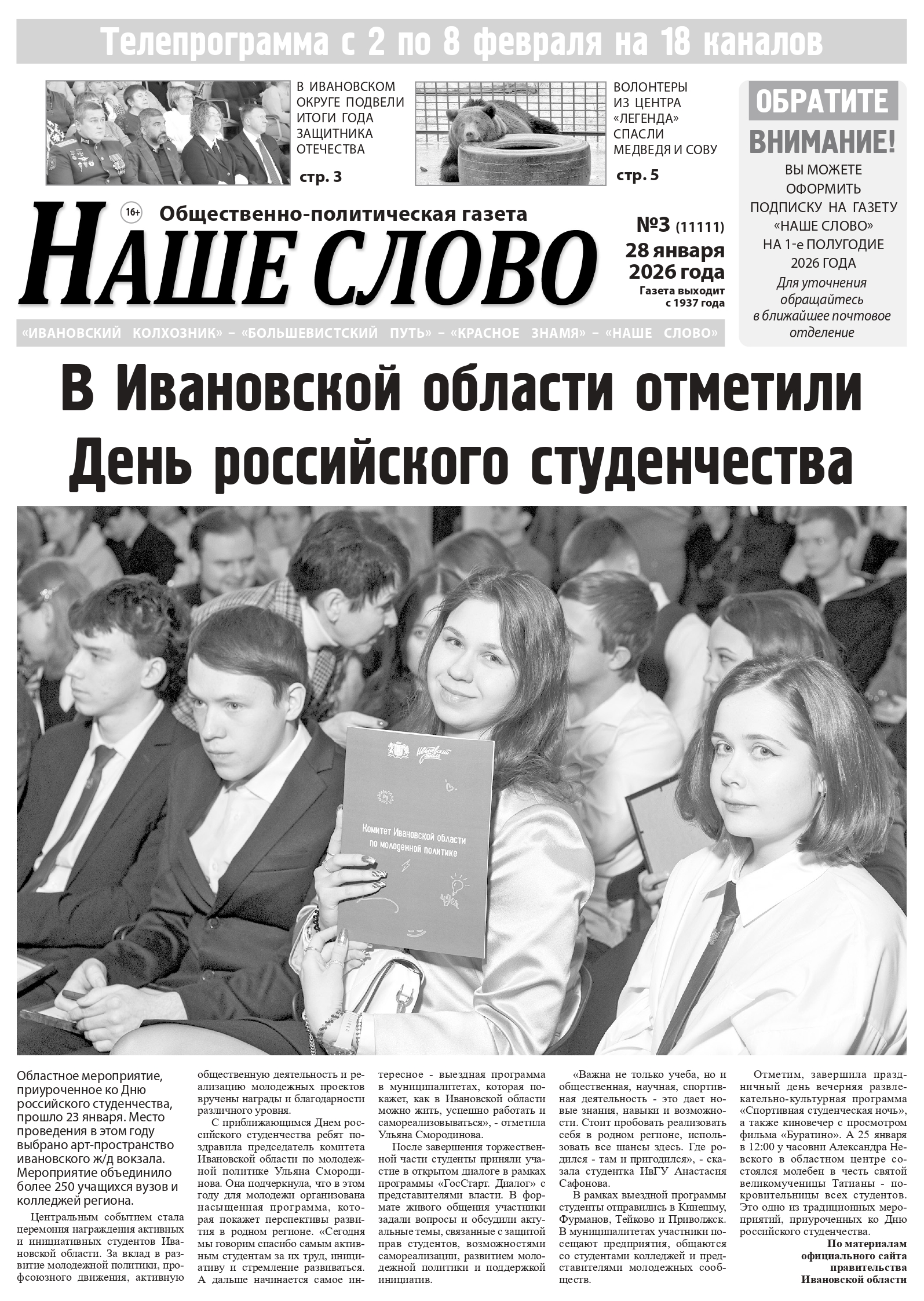 Номер газеты «Наше слово» от 28 января 2026 года