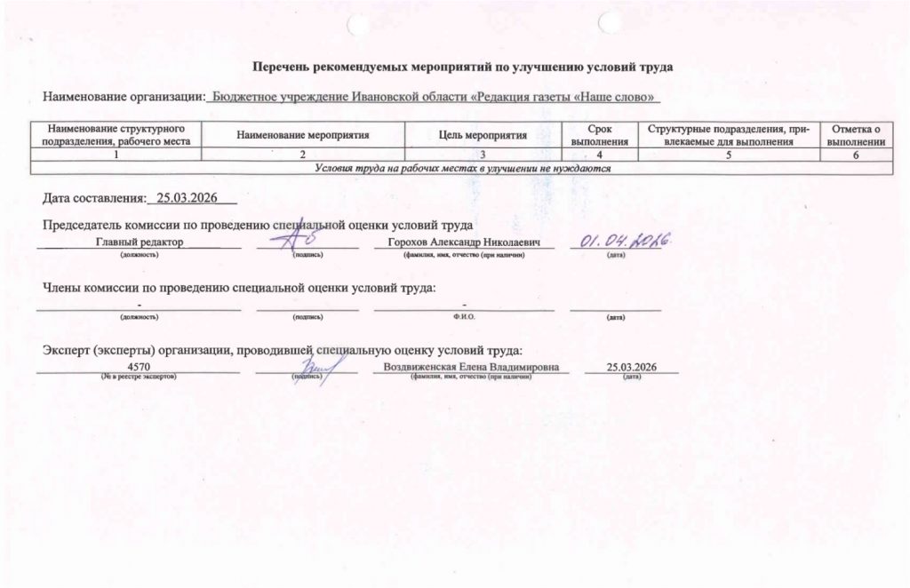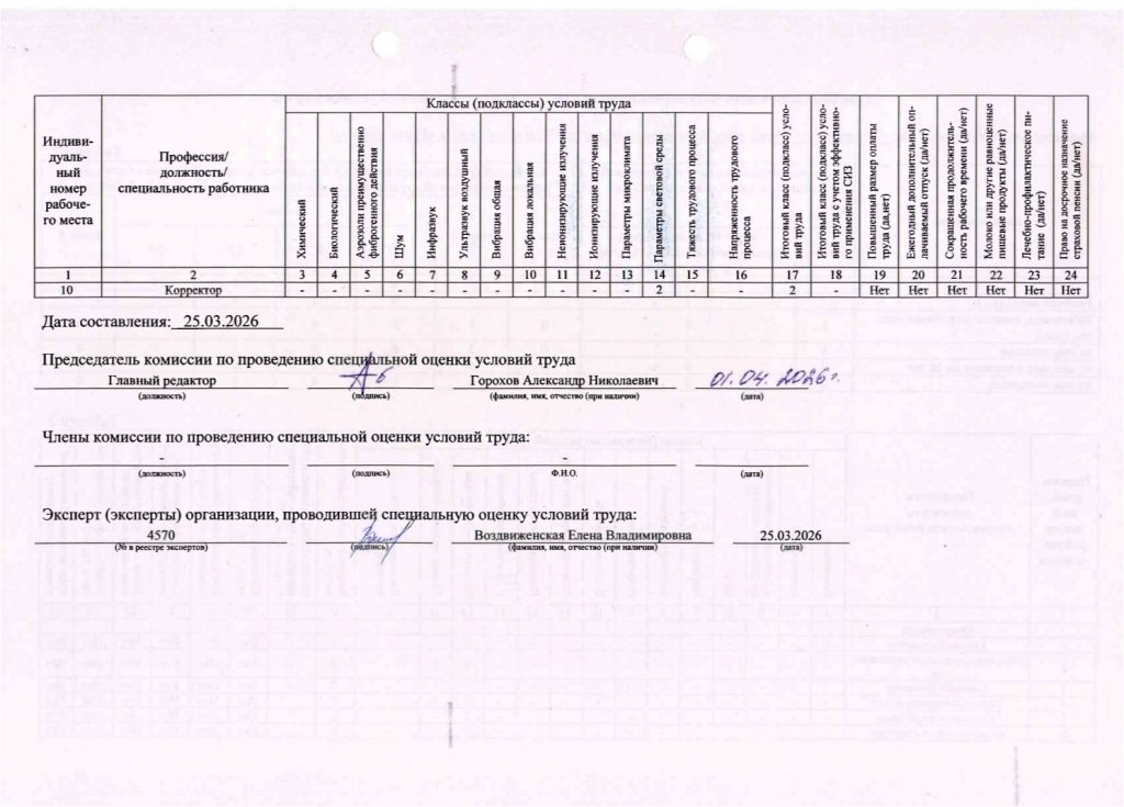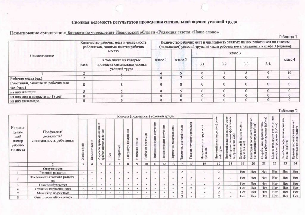 Домой Газета Документы Сводная ведомость результатов проведения специальной оценки условий труда