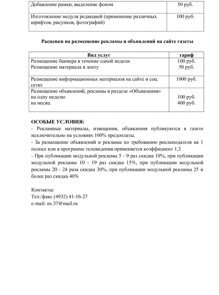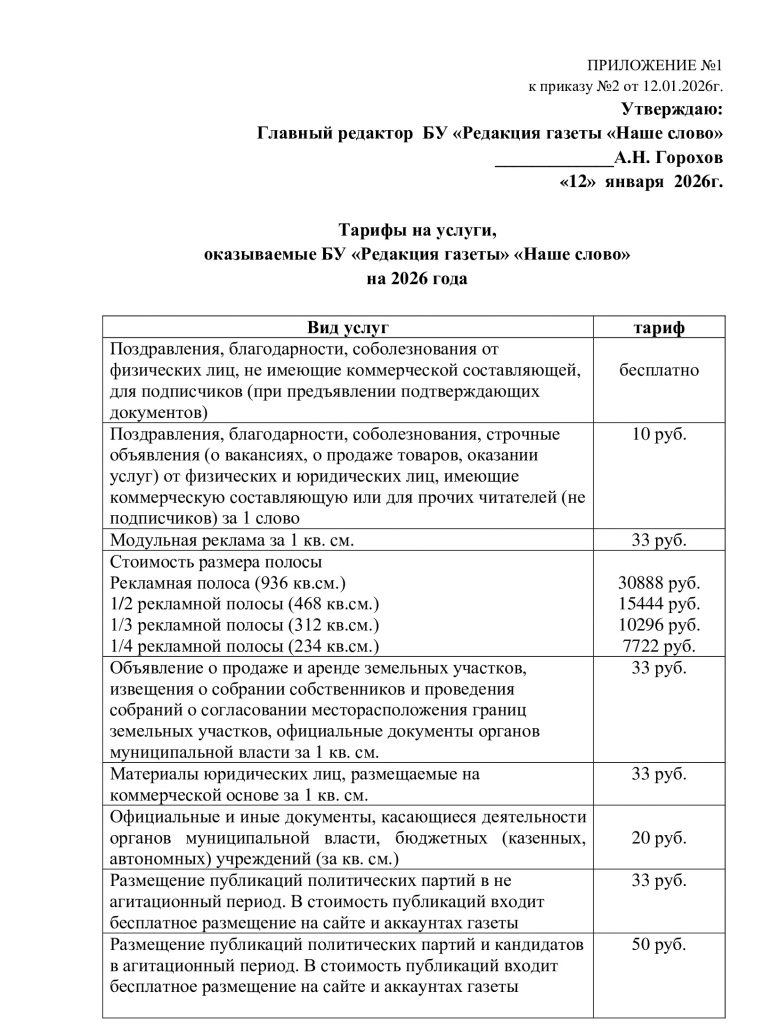 Домой Газета Тарифы на услуги, оказываемые БУ «Редакция газеты» «Наше слово» на 2026 год