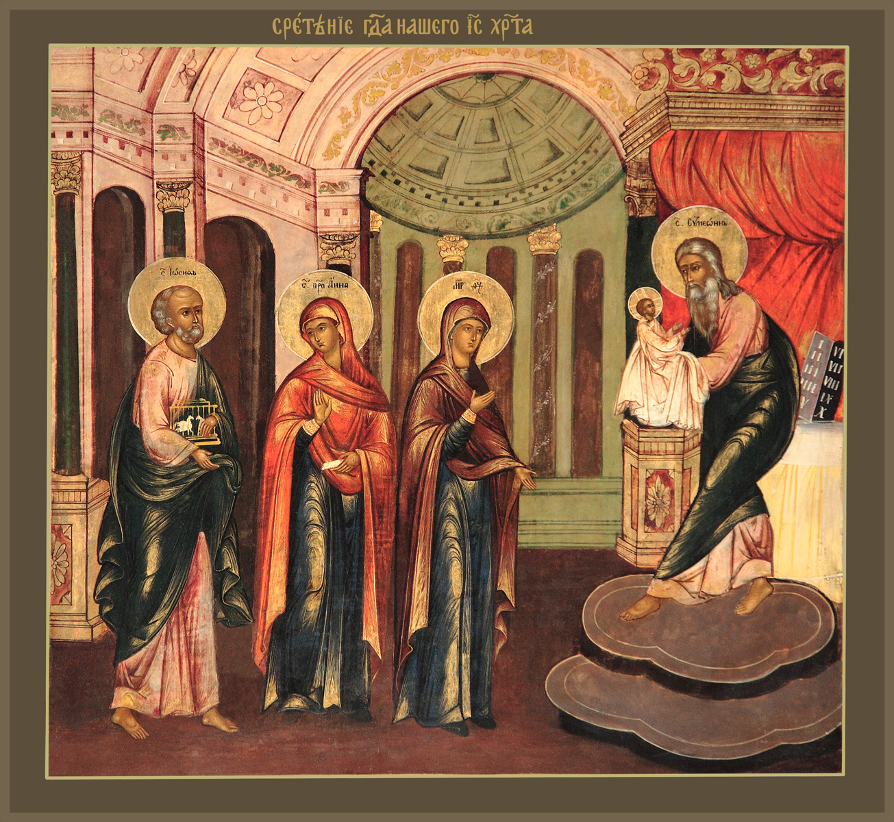 В храме их встретили двое: праведный Симеон и пророчица Анна. Симеону был таинственно предсказано, что он не умрет до тех пор, пока не увидит Спасителя-Христа, прихода Которого в этот мир ожидали в те годы столь многие. Симеон берет Младенца на руки и обращается к Богу со словами благодарности: «Ныне отпущаеши раба Твоего, Владыко, по глаголу Твоему, с миром…» Эту молитву в наше время читают или поют в конце каждой вечерни, а также — что очень знаменательно — в конце Таинства Крещения.